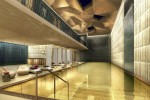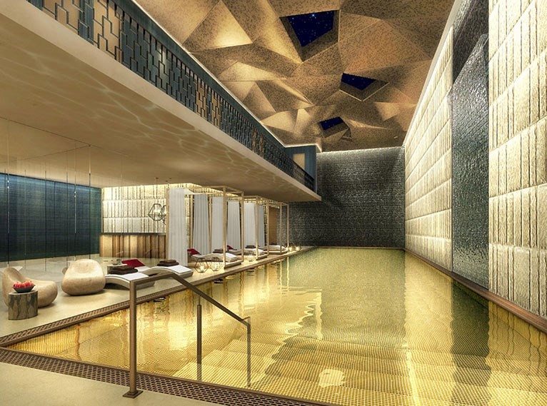 The indoor lap pool sits at the heart of the spa and looks as if the cavernous space has trapped the very source of “Jerusalem Gold” between its faceted ceiling and Jerusalem stone walls. The grand design statements of the rough-hewn lava stone feature wall with its cascading waterfall and the golden crystalline structure of the ceiling capture elements of the volcanic. In contrast to this grandeur, the seven treatment rooms, including a couple’s treatment suite, are simple and calming. They combine warm timber floors with a stone envelope and a light projection wall to create spaces where the focus is all on guest wellbeing.