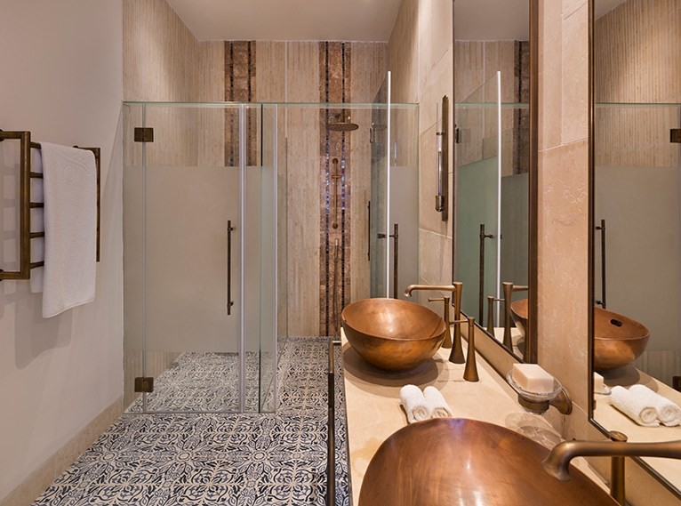 Each of the 39 rooms in The Templar Buildings are unique in their architectural form and detailing, challenging designers with creating 39 distinct spaces. Guestrooms combine luxury with local handcrafted authenticity that bring these buildings to life. The blue and ivory palette is meaningful and represents the “tekhelet” blue recalling the biblical blue of Judaism. Encaustic floor tiles that flow from the bedroom into the bathrooms are similar to those found in the original buildings during restoration. Crafted wrought iron bedframes are focal points in the bedrooms with a blue leather chaise longue at the foot of each bed adding a further touch of opulence. Many of the bathrooms feature a large window through which light streams in, illuminating the fittings that include aged metal basins and mixer taps, as well as a traditional free-standing copper-clad tub.