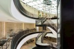 Behind the ark-like reception desk stand three elegant wrought iron and glass display cabinets showcasing collections of artwork from the neighborhood. A handcrafted chandelier cascades through the central oval stairwell and is suspended above a reflection pool two floors below.