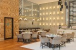This impressive space with its natural warm tones and cool white marble tops is at the heart of the hotel. Jerusalem stone walls carry through from the exterior facade to meet etched mirror-clad walls and semi- transparent etched glass screens, posing a thrilling play of reflectivity, transparency and opacity. An elegant mosaic floor is the stage for a lively show kitchen. Olive wood from the groves nearby adds to the energy of