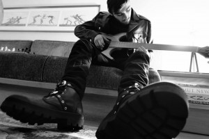 ZaynMalik playing guitar in a Versus biker leather jacket