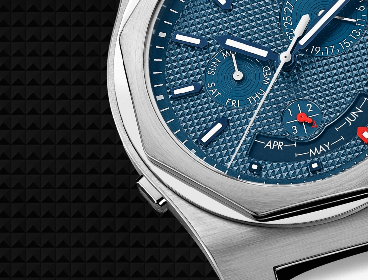 The Laureato Perpetual Calendar debuting at SIHH 2019 asserts its status as a watch exuding a strong, architectural presence. Its blue dial adorned with a Clous de Paris hobnail pattern, against which the white indications stand out in striking contrast, sets the final touch to this resolutely modern timepiece.