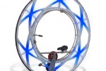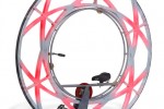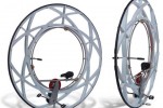 This pedal-powered Monovelo monowheel was used in the closing ceremony of the Olympics in Beijing 2008. The monovelo consists of an inner and an outer frame. The inner frame has three small wheels that make contact with the outer frame. The outer frame is the actual rotating wheel and has a solid rubber tire.