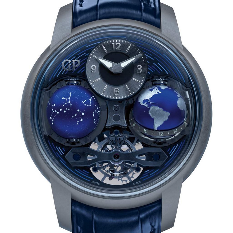 At 9 o’clock, a sky chart – laser-engraved on a blue-tinted titanium globe – rotates every 23 hours, 58 minutes and 4 seconds, the exact duration of a sidereal day.