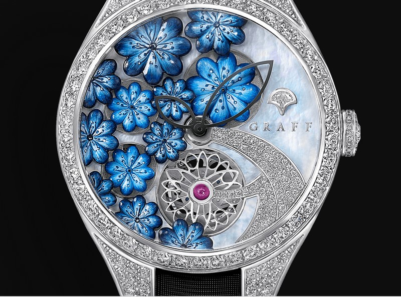 Created using an ancient and extremely challenging technique, the colours of the elegant flowers upon every watch are entirely unique to each dial, and require up to fifty hours to complete, says Graff Diamonds.