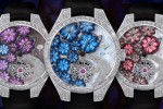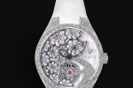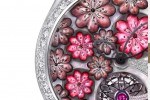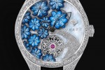 The white dial features white mother of pearl and white gold flowers, with high fire enamel and painted finish, while the blue dial is designed with blue mother of pearl and white gold flowers. The watch functions include hours, minutes with flowers animated at 8 and 10 o’clock. With a power reserve of 46 house, the watch comes with black satin.