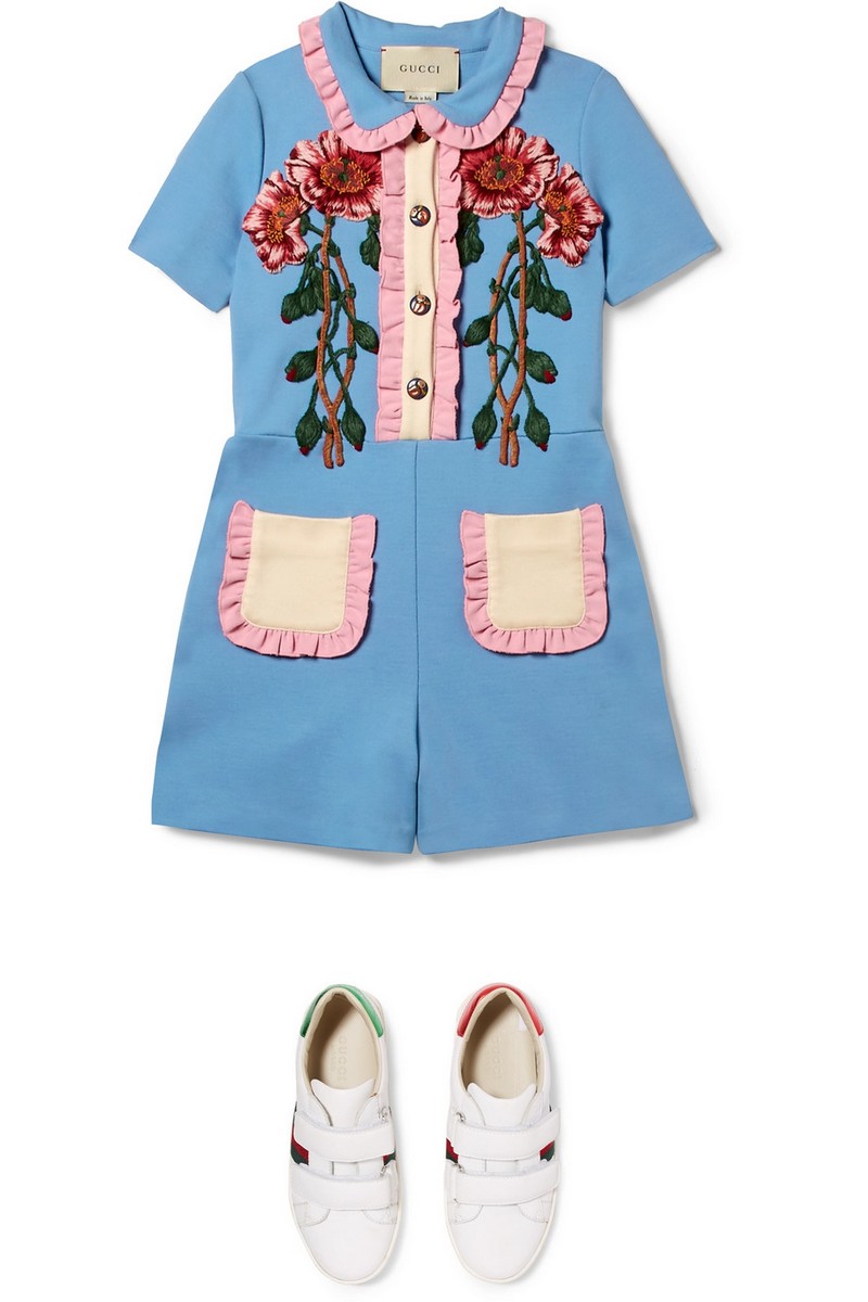 Gucci Kids’ soft light-blue jersey romper is trimmed with pastel-pink frills along the Peter Pan collar and patch pockets, and appliquéd with signature blooming stems. Your little girl will love the miniature ducks on the buttons.