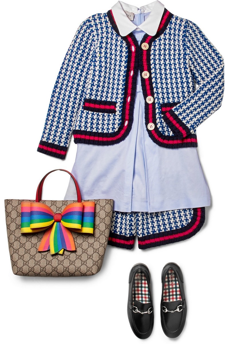 Gucci Kids’ jacket is the mini-me version of the style for adults, but updated with a playful ‘Guccy Wishify’ at the back. Made in Italy from houndstooth intarsia wool that’ll feel so soft against her skin, it’s edged with the label’s signature red and navy stripes. Pair it with these shorts for a cute matching look.