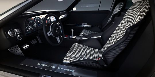 Discover the world’s most prestigious gatherings & exhibitionsThe interior of the 2011 Mercedes Ciento Once resembles the original from the 70’s with some updated features: carbon fiber seats covered in plaid, instrumentation modeled after a W120R MB (including the radio and the a/c control unit), brushed aluminum pedals, dashboard accent, and illuminated door sills.