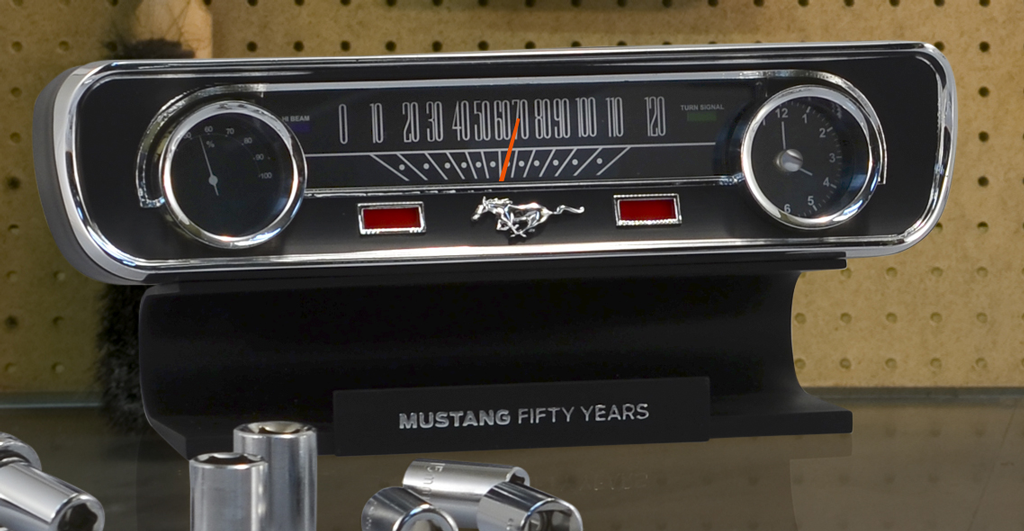 To commemorate the 50 years of Mustang’s continuous production, Mark Feldstein & Associates introduced a limited edition 50 Years of Mustang Desktop Sound Clock Thermometer.