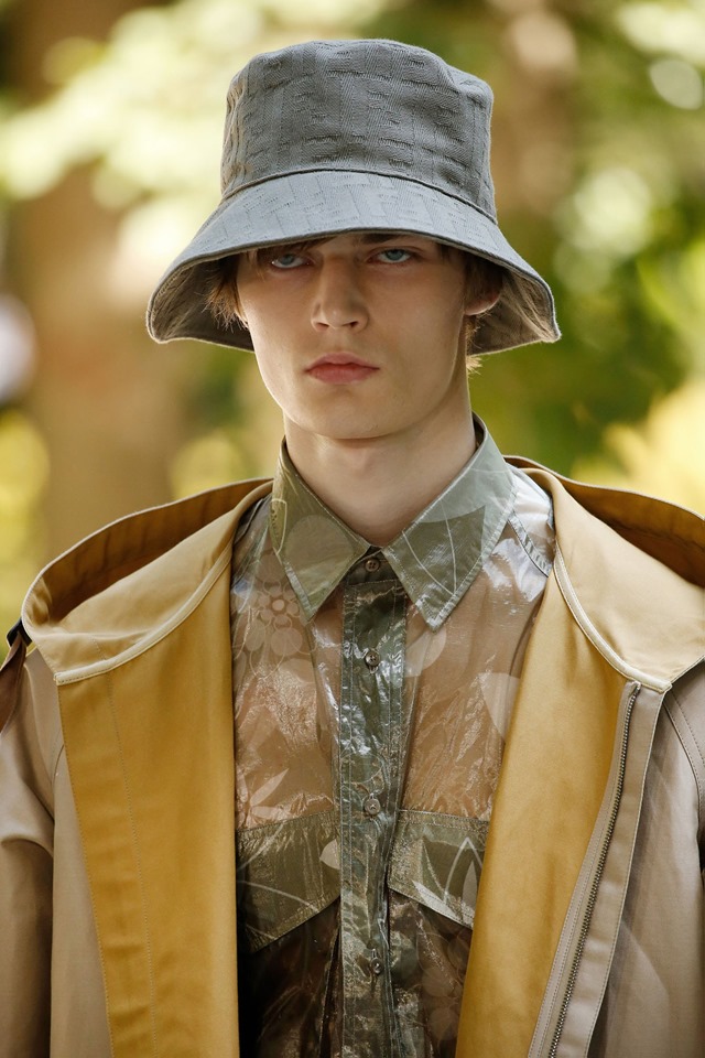 Meanwhile, the super-luxury labels Fendi and Louis Vuitton channelled gardening – cue hats galore. In Milan, Fendi closed its show (designed in collaboration with the Oscar-winning film director Luca Guadagnino) with a denim jumpsuit and curvy brimmed number with its FF logo woven into it. Virgil Abloh at Vuitton cited Jamiroquai in his show notes where a monogrammed PVC rain hat and lilac straw technical gardening hat were both featured.