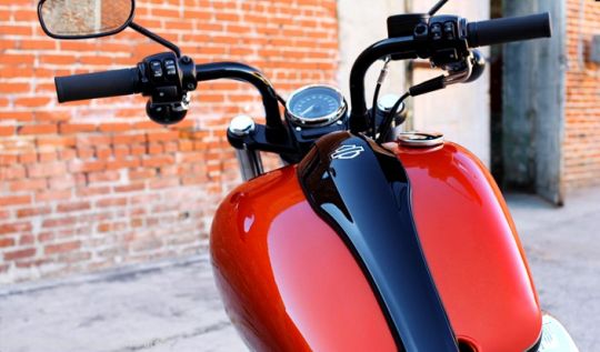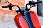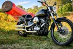 The Harley Blackline is reminiscent of the glory days of Harley-Davidson motorcycling—the black headlight, slammed speedo mounted on the triple clamp, round air cleaner cover and black horseshoe oil tank are reminiscent of pre-war H-D parts and accessories; the fuel tank with small tank graphics are inspired by the 1977 Low Rider motorcycle; and the black cylinders with gray heads and black rocker covers is a look you’d find on the Panheads and Shovelheads of the 1950’s and 60’s.