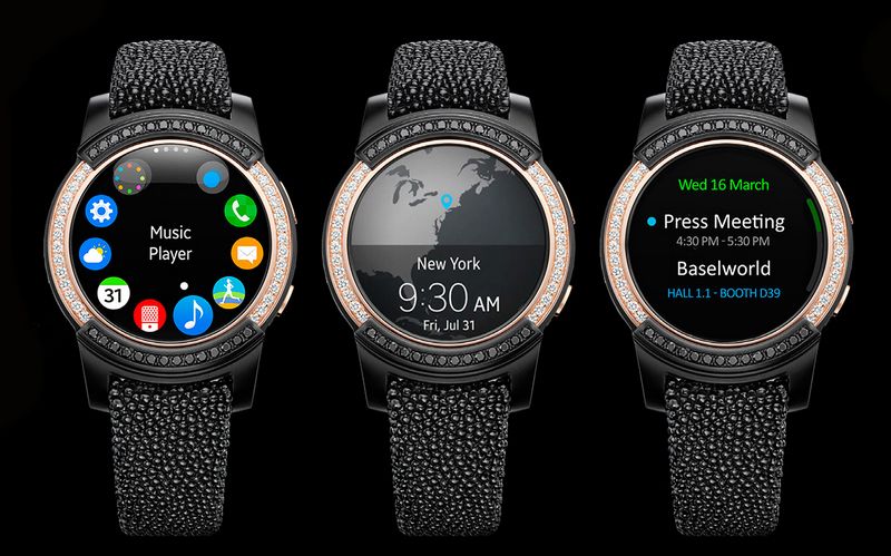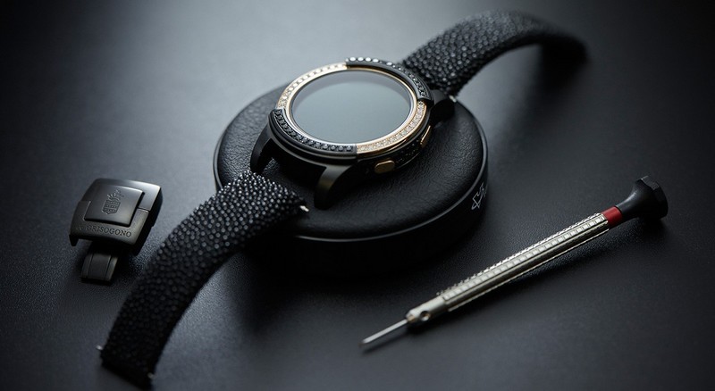 The smartwatch is transformed into smart fashion with rose gold, over 100 black and white diamonds and a bracelet studded with de Grisogono’s signature galuchat. The diamond-set gold bezel turns freely around the dial, allowing consumers to access the Gear S2’s library of applications and features, including notifications, activity logs.