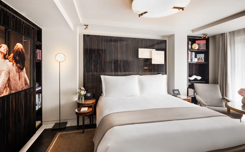 Among them, the Haute Couture Suite by Isabelle Huppert — designed by architect Jean-Michel Wilmotte — has always been the most intellectually demanding. Styled like a Parisian apartment with views across the capital’s rooftops, it blends what the actress herself calls the rigor of a masculine wardrobe with French glamour: precise, unsentimental, and genuinely beautiful. Now, four years after its inauguration, the suite has been enriched with a new set of personal selections that make it feel even more completely, unmistakably hers.