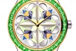 More than one hundred and eighty metals and stones of varying nuances and forms decorate the dial. The voluminous dial of the 2016 Dior Grand Soir is adorned with mother-of-pearl, ornamental stones, polished gold petals and precious stones. The bezel is set in diamonds, sapphires or tsavorite garnets in geometric shapes, accentuating the bewitching symmetry of the dial.