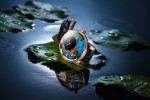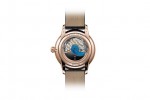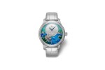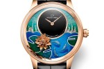 The scence has been reproduced at a scale of 41 mm, with the dial set over a tranquil pond of crystalline waters created through subtle layering of translucent blue enamel. Two lily pads float gracefully on the surface, crowned by a blooming lotus applied in relief, and hand-engraved gold reed stems rise from the waters. Under the enamel, three elegant koi carp glide along in a spontaneous underwater ballet, standing out against the background of wave-ridged gold. The enamel lightens across the upper half of the watch face in gradually shaded colors underscored by an engraving of sky and birds. Here for the first time, Jaquet Droz presents an enameled balance weight decorated with a carp hand-engraved in bas- relief.