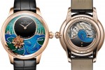 The silhouettes of three koi carps, the symbol of love and long life, bring alive the dial of the new Petite Heure Minute Relief Carps watch by Jacquet Droz (Swiss watchmaker since 1738).