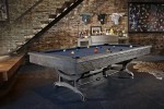 The distinctive Birmingham features a distressed charcoal finish, hammered metal sights, and a wrought iron base and turnbuckle stretchers that give this billiards table an industrial vibe. It comes in an 8 or 9 foot option and starts at $12,999; the matching cue rack is $999.