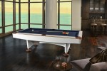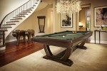 Its elegant horseshoe pedestal design inspired the Lexington’s name. A matte cherry finish, concave apron and mother-of-pearl sights complete this billiards table’s graceful look. The Lexington billiard table comes in an 8 or 9 foot option and starts at $7,499; the matching cue rack is $999.