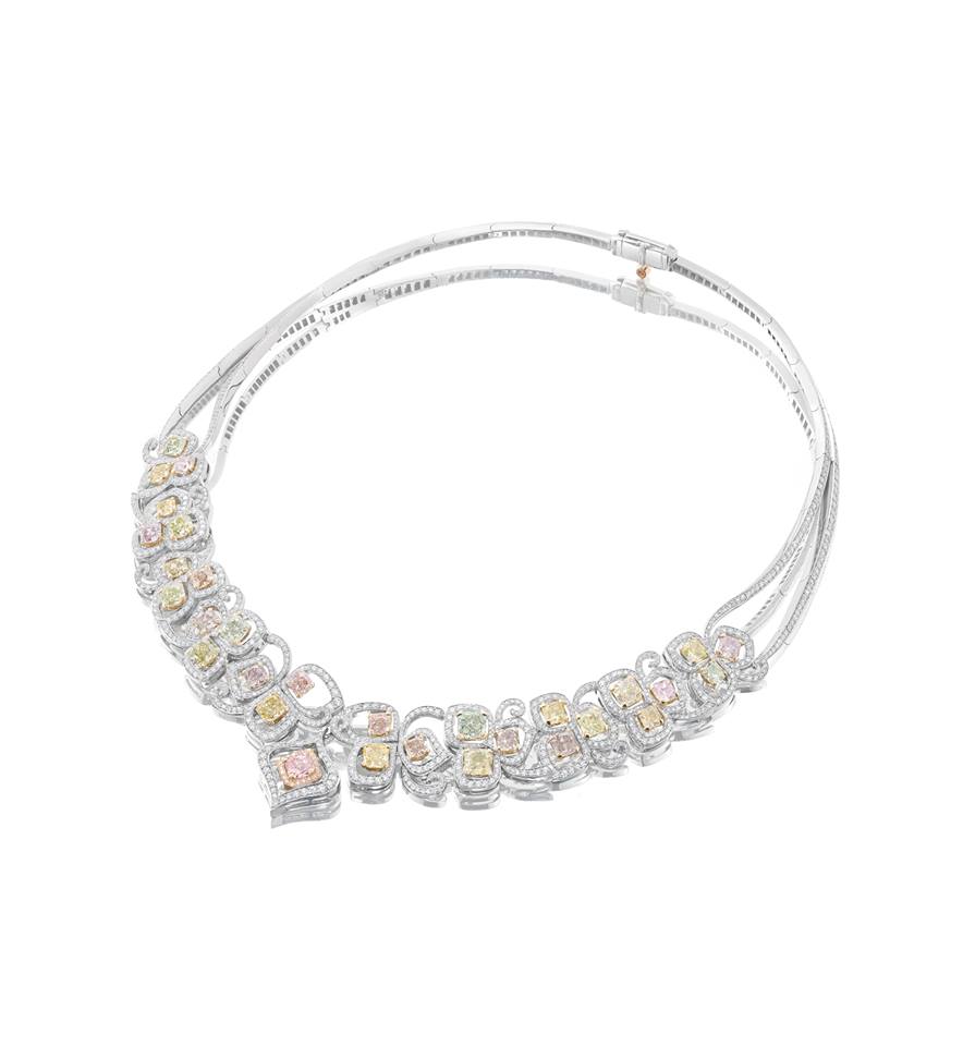 The Greenfire necklace incorporates seven cushion cut emeralds totalling 46.20 carats surrounded by 17.38 carats of round brilliant cut diamonds, while The Greenfire Pendant features a 12.41 carat cushion cut emerald surrounded by round brilliant cut diamond.