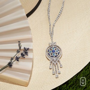 460 scintillating diamonds and 13 vibrant sapphires and aquamarines unite in a jewel of timeless allure