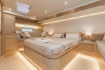 The owner’s suite is located aft featuring a full-beam cabin: 6 metres wide, it has a king-sized bed at the centre, flanked on one side by a sofa and on the other by a study area. The bathroom is divided into two parts, with one room devoted exclusively to a large shower.