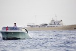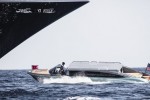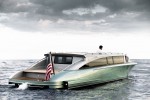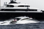 The tender features a dramatic exterior paint scheme with a surprisingly chic optional leather and specialty wood veneer interior. With accommodations for up to 11 guests, including two oversized owners’ seats, amenities consist of a high definition entertainment system, refrigerator/bar, and climate control. The port and starboard side windows power down, to reveal generous guest boarding access. The entire salon hardtop rises hydraulically, which allows full-height headroom, for ease of boarding and 360 degrees of visibility.