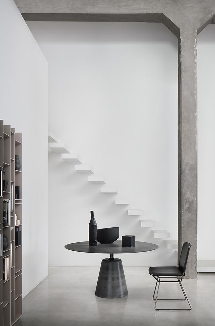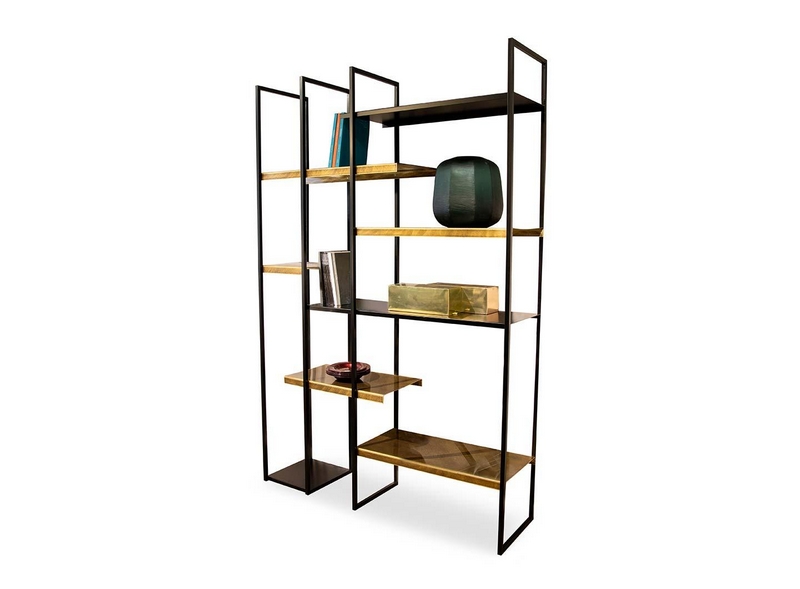 The first module was designed as a bookshelf that can be placed against a wall or used as a discreet room divider, and the second can work as a sophisticated shelving system up against a sofa. The slender graphite painted metal frame is accompanied by hand-brushed brass shelves, conferring a look of timeless fascination.