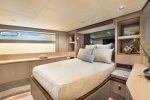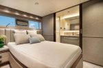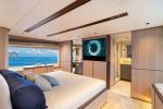 Situated furthest forward on the main deck, the full-beam master stateroom features a his-and-hers ensuite. Mirrored nightstands with quartzite trays and a sophisticated reeded quartzite feature wall above the headboard highlight the modern space. Four queen-sized VIP staterooms are situated on the lower deck and include mirrored staterooms amidships, another to port and the fourth in the bow. Spacious crew quarters and a beach garage with freestanding furnishings are found aft of the engine room.