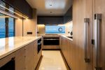 Electric light grey honeycomb blinds minimize the natural light and provide privacy when needed. Highlighted by water-bleached walnut and dyed Koto as the feature woods, the salon features an exquisite oak wood flooring in a herringbone pattern. A spacious seating area with a wine cabinet and dayhead is positioned aft, with the dining area and galley with a privacy screen and full-height storage amidships.