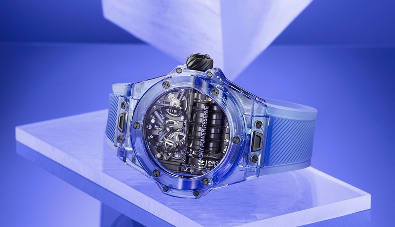 The new Big Bang MP11 Blue Sapphire knows no limits. Playing on transparency, this exclusive timepiece limited to 50 pieces takes its radiance and inimitable colour from one of the manufactured sapphires that Hublot has developed in house.
