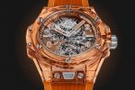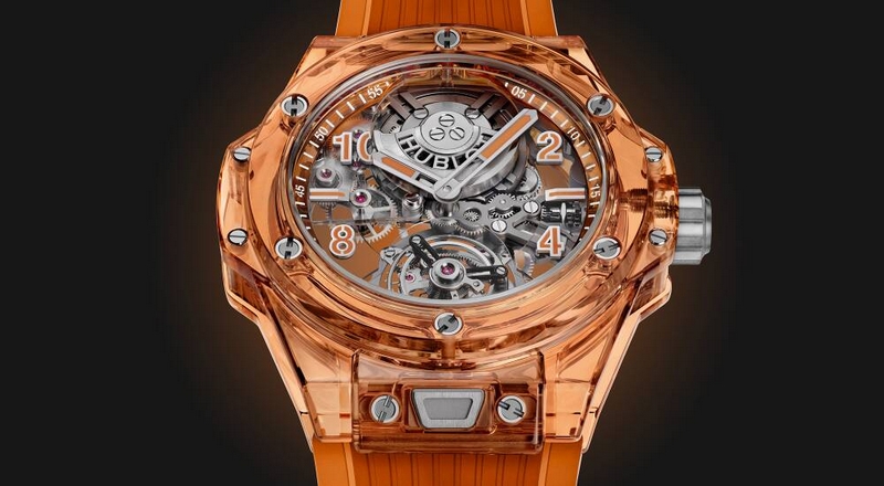 Hublot is renowned as well for innovation in colors and sapphires. The exclusive transparent, black, yellow, blue and red shades for Hublot watch cases are now joined by the Big Bang Tourbillon Automatic Orange Sapphire. This dynamic orange shade marks an exciting world first. Faithful to the “Art of Fusion”, this aesthetic innovation is joined by technical prowess for the new self-wining tourbillon movement, along with a micro-rotor visible through the case and three sapphire bridges. This cutting-edge limited edition is being released in just 50 pieces.