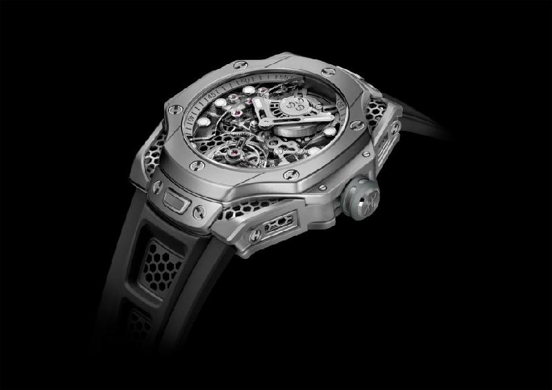 The industrial allure of this limited edition timepiece is immediately evident. Every element, from the case to the crown, boasts the sheen of micro-blasted titanium, a testament to Samuel Ross’s meticulous attention to detail. The clasp, adorned with a rough laser engraving of the Hublot logo, adds an element of rugged sophistication to the overall design. To complete the gray monochrome aesthetic, the crown is skillfully overmolded in gray rubber, merging style with functionality.