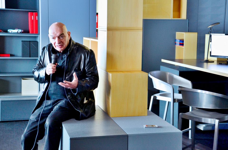 A monolith rises in the middle of SaloneUfficio, intriguing and alluring, with four video-portraits of thinkers raise their concerns and express their views on the office environment: designer Agnès B, photographer Elliot Erwitt, artist Michelangelo Pistoletto and writer/director Alain Fleisher.