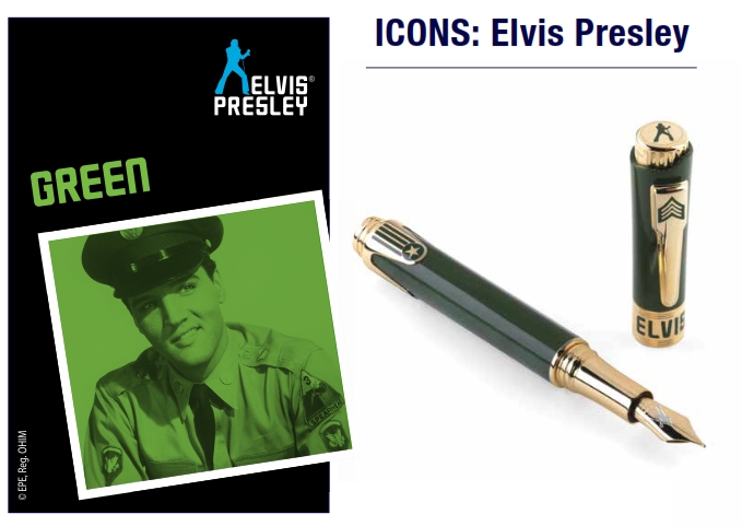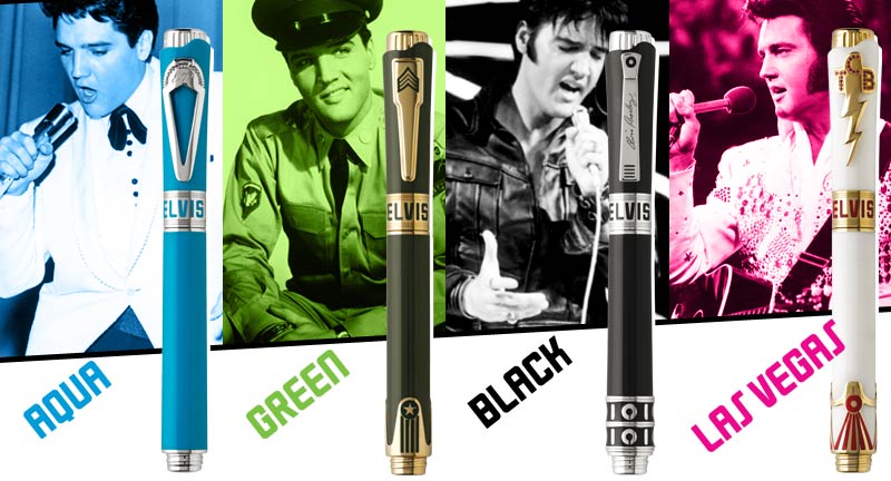 Each pen possesses a resin body in a color suggestive of the each era, with silver accents also representative of the period. The fountain pen nibs are engraved with the full-height profile of Elvis at the microphone. Other details unique to each pen and the packaging also denote the specific stage of Elvis’ career, and is accompanied by a CD of Elvis’ Greatest Hits, announced Montegrappa.