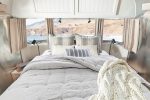 The travel trailer can sleep up to four people, and its twin or queen size bed options come with Pottery Barn Belgian Flax Linen Bedding to provide total comfort at the end of an adventurous day.