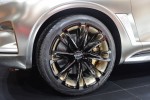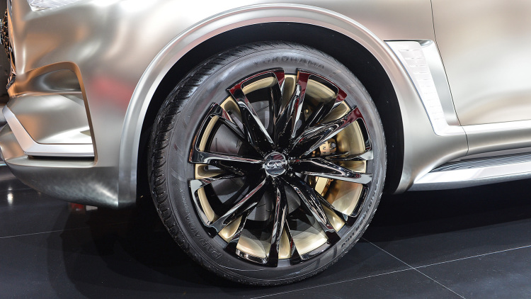 Straight-spoke, two-tone wheels – 24 inches in diameter – are finished in chromium black with contrasting brushed copper elements. The outer edges of the wheels overlap the tires, presenting the appearance of a 26-inch wheel and low profile tires to complement the scale of the QX80 Monograph.