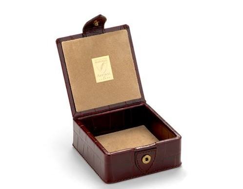 This Small Stud Box is exquisitely crafted in Amazon Brown Italian calf leather with a mock croc print finish, lined with the labels signature soft-suede in stone. Secured with a leather flap and press-stud fastening, it is perfectly sized for storing ladies earrings or gentlemans cufflinks alike.