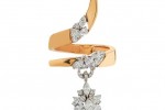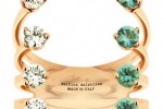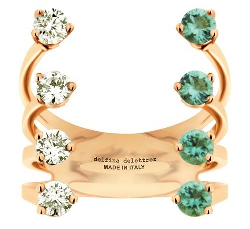 Italian born brand Delfina Delettrez creates delicate jewellery, subtly embellished with glistening stones. Decorated with four white diamond and four green emerald embellishments in a claw-like design, this pink gold ring demands attention.