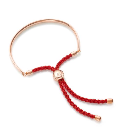 Crafted with 18kt Rose Gold Vermeil on Sterling Silver, Monica Vinader Fiji Friendship Bracelet features the iconic sleek bar design and is complemented with a charming Coral Red adjustable cord for good luck.