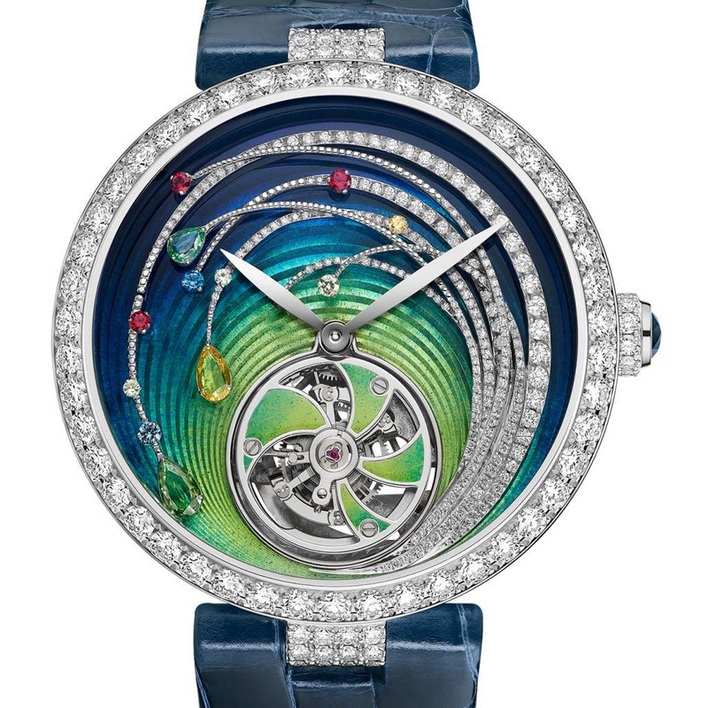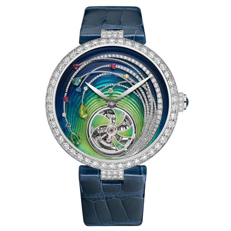 Curved, with a unique horn and gem-set on all sides, it emerges from an alligator leather strap to float atop the wrist. Its multicoloured grand feu enamelled dial, realised with supreme skill by the artist Anita Porchet, features a guilloché finish. Then the topazes, garnets, sapphires, rubies and tourmalines are arranged at the end of diamond-set gold spirals. The largest of them, a pear-shaped garnet, is mounted en trembleuse to vibrant and sparkling effect.