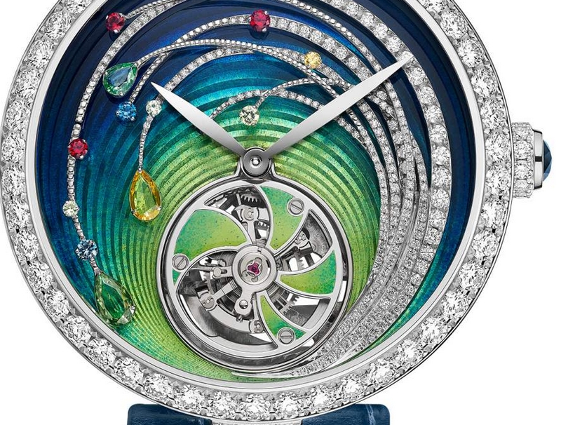 Chaumet’s new High Jewellery timepiece in radiant colours and fiery stones is animated by a Flying Tourbillon caliber, whose movement echoes that of the sun.