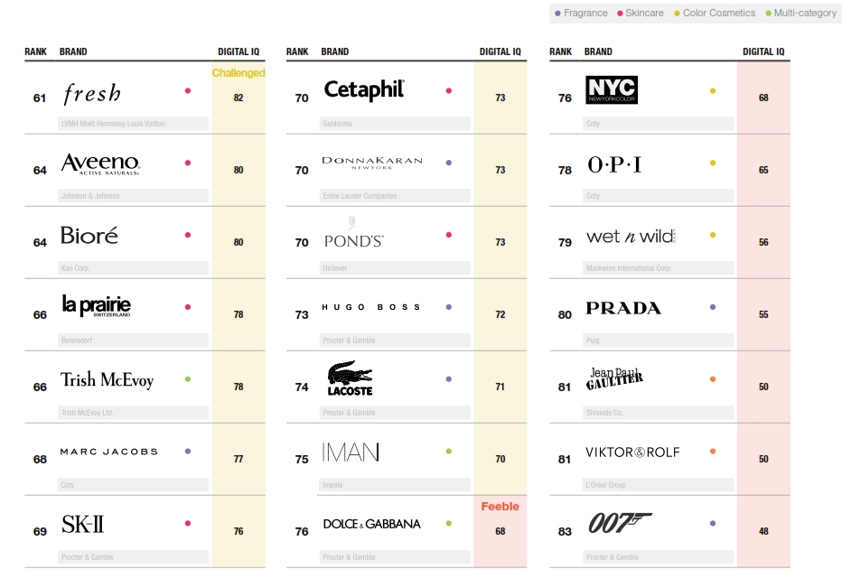 - Fragrance brands lag in the sector, with 60 percent earning Challenged or Feeble scores.