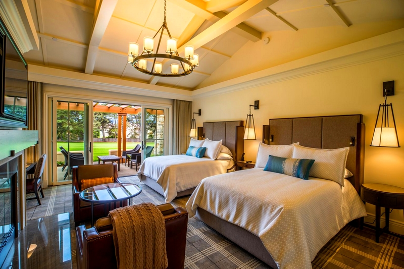 Fairway One offers Pebble Beach guests a new and enhanced guest room experience. Fairway One Cottages are named The Eastwood Cottage and The Palmer Cottage for two of the more famous owners and board members of Pebble Beach Company – Clint Eastwood and Arnold Palmer. Each cottage fronts the first fairway and features a 1,000-square-foot living room, two king bedrooms, two queen/queen bedrooms – all in a uniformly white architectural palette accented with rich earth tones and in keeping with the style and feel of The Lodge – and an outdoor terrace with fire pit. Living rooms have 17-foot-high wood-beam ceilings, rich wood millwork, and floor- to-ceiling stacked stone fireplaces, along with two 55-inch HDTVs, a wet bar, and a dining area. Groupings of oversized furniture encourage guests to gather and socialize.