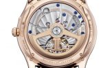 On the reverse side, the long span of the open-worked tourbillon bridge further enhances this transparency, while its Côtes de Genève decoration complements the sunray pattern of the stripes on the main plate. The open-worked pink gold winding rotor, which features the JL logo and a combination of polished and micro-blasted surfaces, allows a clear view of the movement, with additional fine finishes including blue screws, circular graining and chamfered bridges.