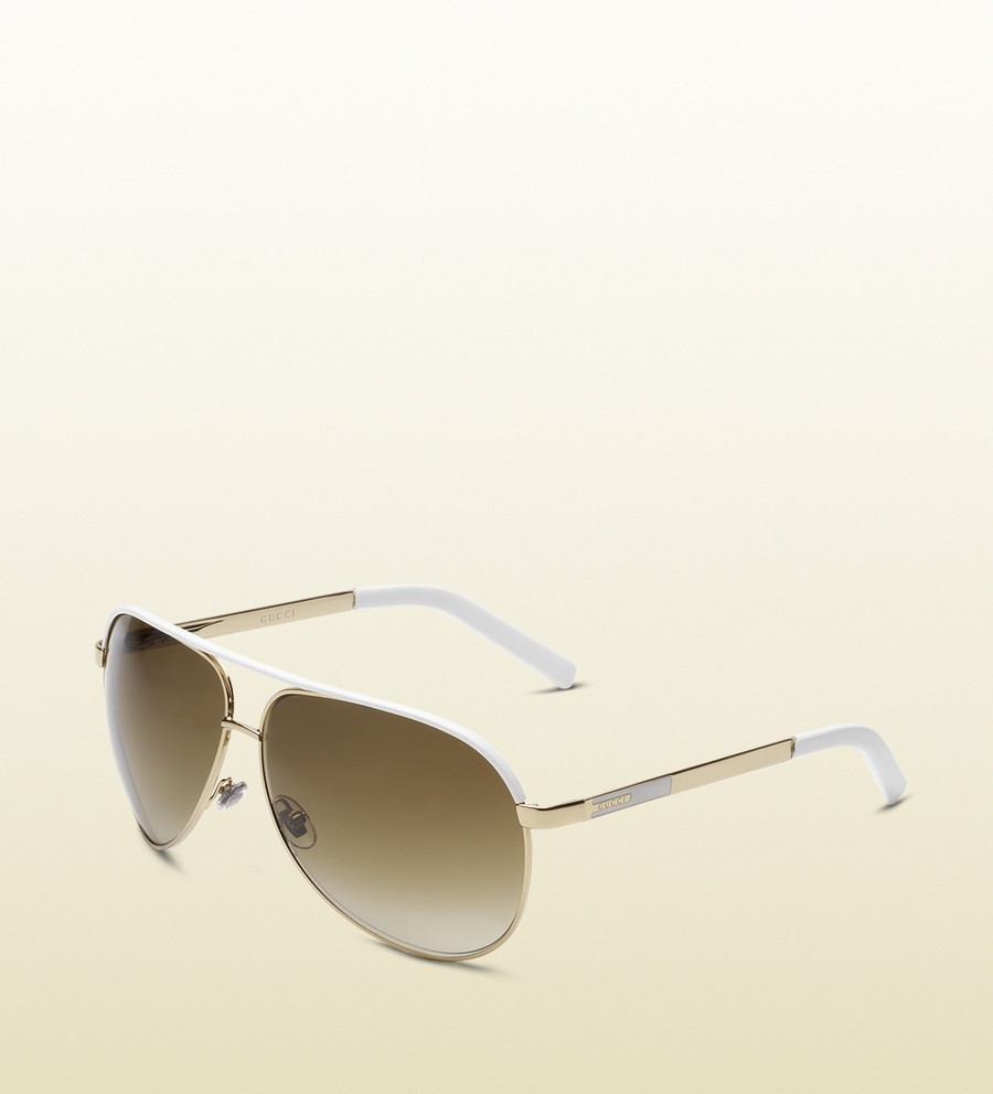 Crafted from a special lightweight alloy, Techno Color shades pair minimal frames with boldly colored lenses. The collection includes classic aviator sunglasses with gucci logo on temple (100% UVA/UVB protection), techno color ultra-light bamboo sunglasses reinterpreted for spring/summer 2014 collection, and gold endura cat-eye sunglasses.