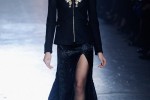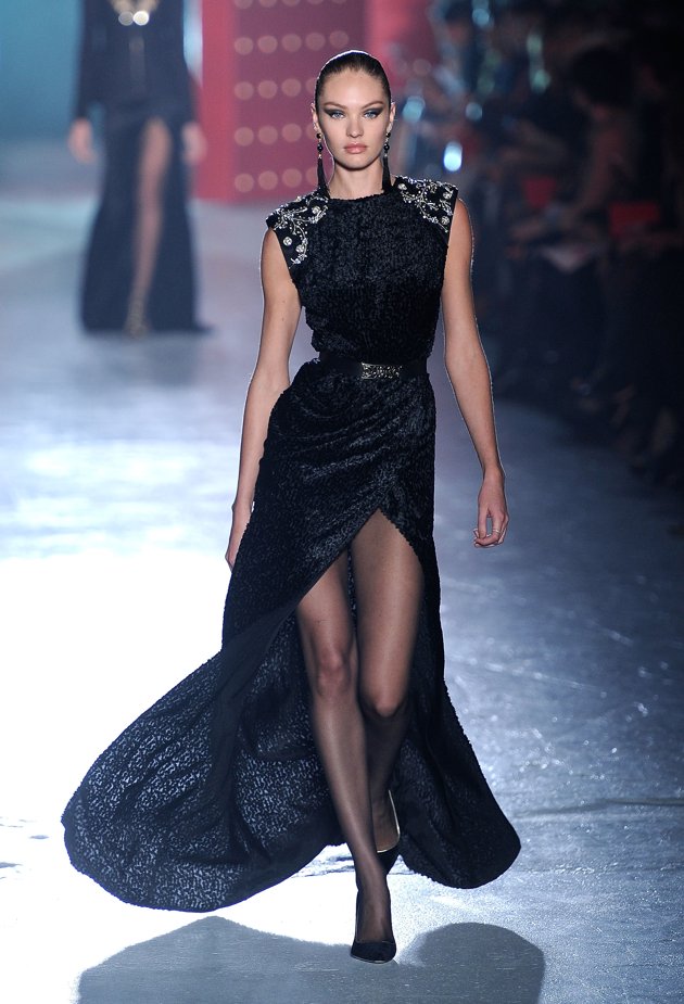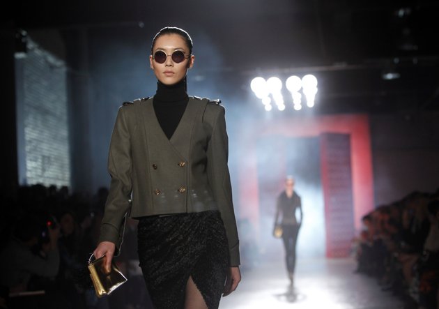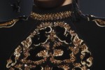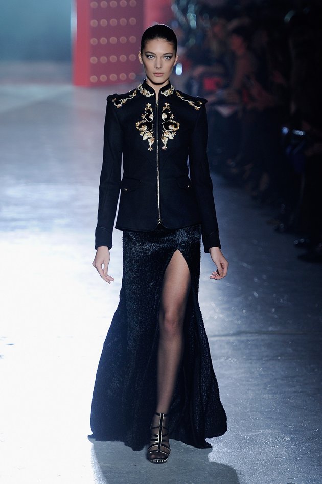 He tapped into Chinese military uniforms with Mao jackets, grommets, strong shoulders and capes — the best of that look being the green coat with attached cape and black lace that opened the show. A different sort of strength, however, is found in the ornate trappings of the Qing Dynasty and the tassels, embroideries and brocades worn by empresses.
