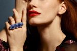 As the protagonist of the Gucci Hortus Deliciarum High Jewelry campaign, Jessica Chastain wears a selection of solitaire rings showcasing the vivid hues of unique gemstones such as yellow beryl, blue tanzanite and pink tourmaline.; Jessica Chastain for @Gucci Hortus Deliciarum High Jewelry 2022
