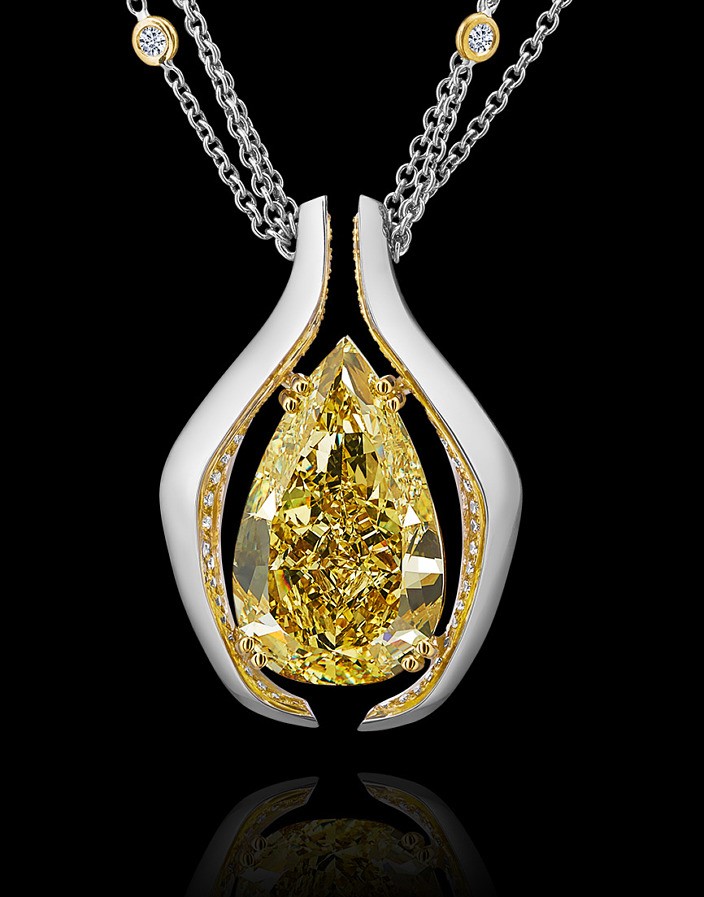 Jewellery Arabia Show 2019: Bentley reveals spectacular pendant with beautiful 20.08 natural pear-shaped yellow diamond.