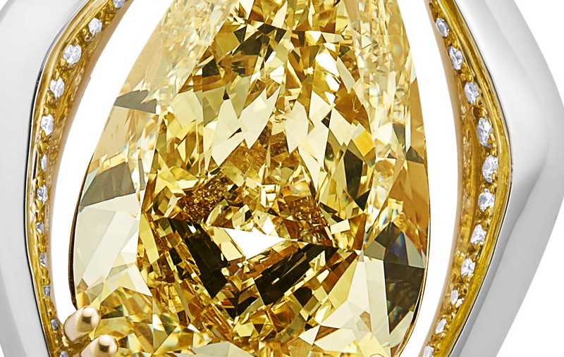 Revealed at the 2019 Jewellery Arabia Show in Bahrain in its glorious gold and platinum setting by Bentley designer Chris Cooke, this 20.08 carat pear-shaped fancy yellow diamond celebrates Bentley’s centenary.